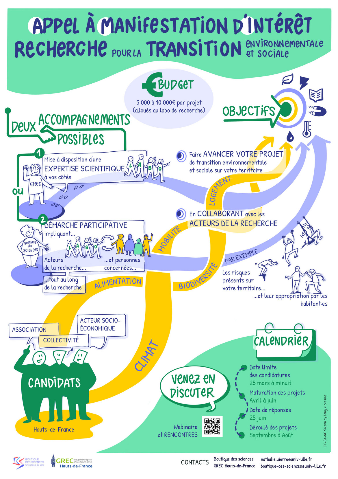 Le GREC Hauts-de-France et la Boutique des sciences de l’Université de Lille vous proposent un accompagnement et un soutien financier pour collaborer avec des chercheur-es de la région. Sont concernées les expertises scientifiques et de recherche au sujet du changement climatique et de la transition environnementale et sociale au sens large : climat, biodiversité, risques, perceptions et appropriation des habitant-es, logement, alimentation, etc.