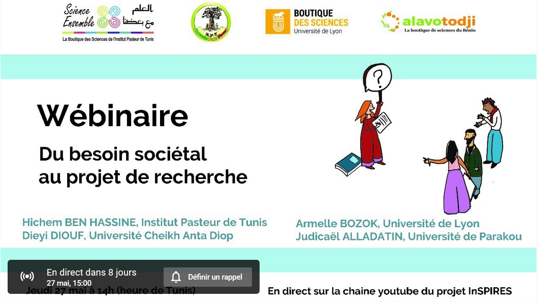 Dans le cadre des activités du projet européen InSPIRES, la Boutique des Sciences de l’Institut Pasteur de Tunis a lancé un cycle de webinaires intitulé : “Les Boutiques des Sciences à l’Université” destiné aux communautés universitaires et académiques intéressées par la recherche participative et notamment l’approche des Boutiques des Sciences. Suite à notre premier webinaire illustrant les pratiques de la recherche participative et les interactions entre Science et Société, sous forme de témoignages de différents membres de Boutiques des Sciences, nous avons le plaisir d’annoncer le deuxième webinaire intitulé “Du besoin sociétal au projet de recherche” qui se déroulera le jeudi 27/05/2021 à partir de 14h00 (heure de Tunis). Ce webinaire vous permettra de découvrir comment les besoins exprimés par la société peuvent être convertis en projets de recherche réalisés en collaboration entre les acteurs de la société, les scientifiques et plusieurs parties prenantes.